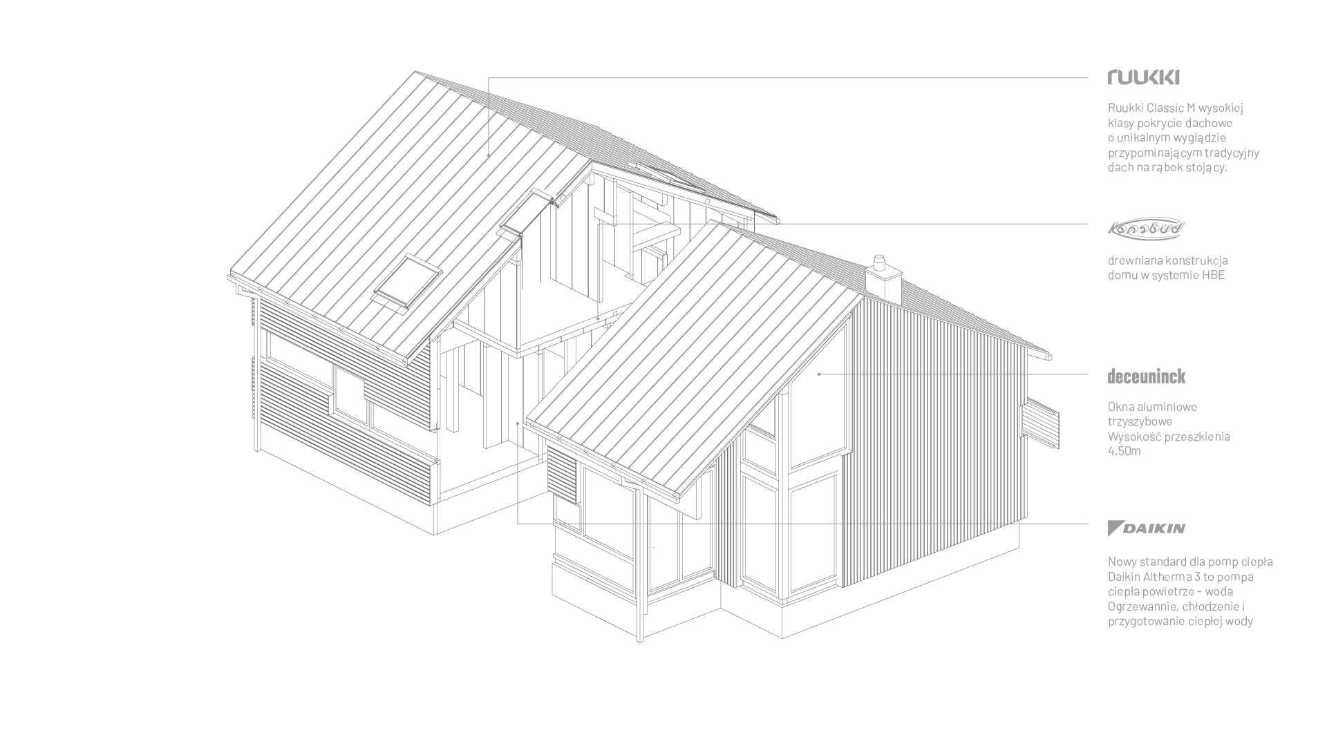 Skromna bryła kryje bogate wnętrze: salon z wysoką kuchnią i widokiem na taras i jezioro w aluminiowej ramie okna. Utrzymanie takich luksusów kosztuje grosze, bo od spodu dom zasila pompa ciepła, a od góry słońce łapie fotowoltaika. Kupujesz dom gotowy do zamieszkania, z podłogami, wykończonymi łazienkami, kuchnią i sauną, tylko wstawić meble.